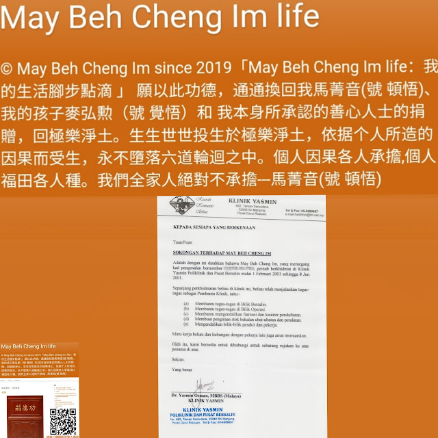© May Beh Cheng Im since 2019「May Beh Cheng Im life:我的生活腳步點滴 」 願以此功德,通通換回我馬菁音(號 頓悟)、我的孩子麥弘勲(號 覺悟)和 我本身所承認的善心人士的捐贈,回極樂淨土。生生世世投生於極樂淨土,依据个人所造的因果而受生,永不墮落六道輪迴之中。個人因果各人承擔,個人福田各人種。我們全家人絕對不承擔---馬菁音(號 頓悟)